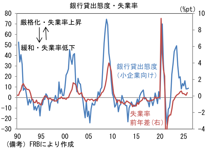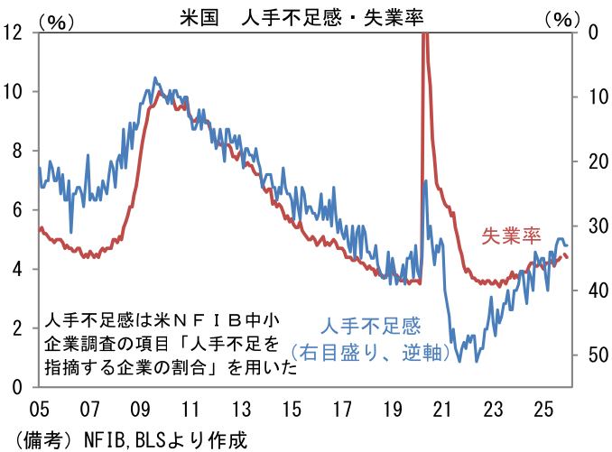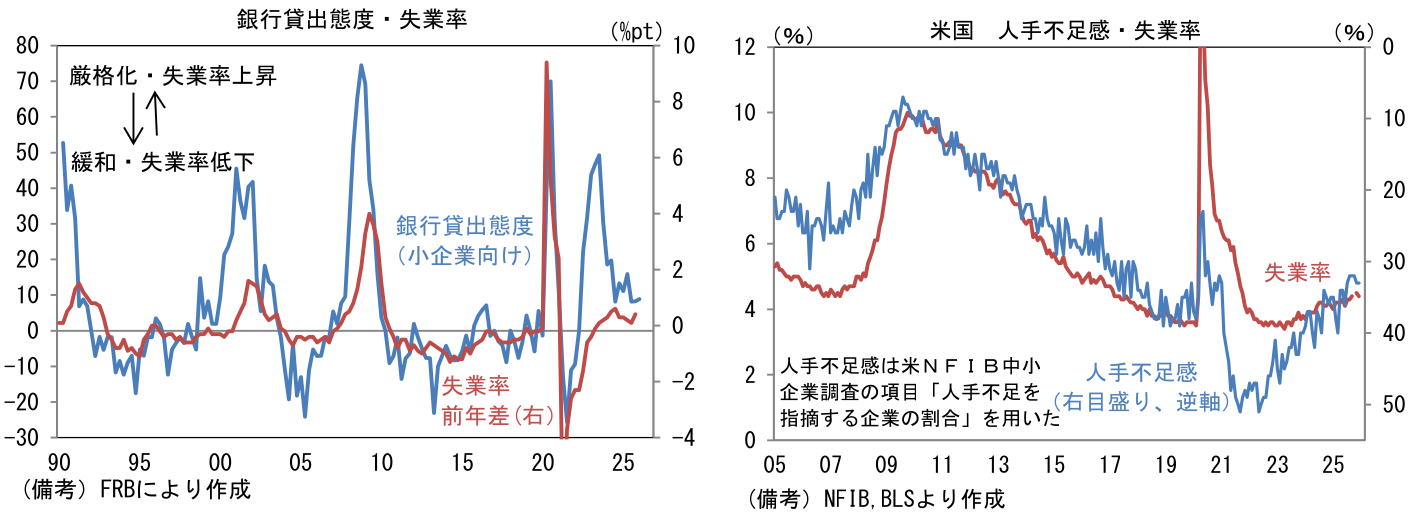 - ここで別の角度から失業率の行方を占ってみると、企業の存続に重大な影響を与え得る銀行の貸出態度(小規模企業向け)は安定している。Fedが2024年に金融緩和方向に舵を切ったこともあり、貸出基準を厳格化する動きは抑制されている。過去、金融引き締め等により銀行の貸出態度が厳格化すると、中小企業を中心に資金繰りが圧迫され、その結果として失業が発生するという因果の向きがあったと推察されるが、現在のところそうした経路での失業率上昇を懸念する状況にはないだろう。またNFIB中小企業調査では人手不足感の残存が示されており、ここから判断すると失業率の加速度的な上昇は見込みにくい。