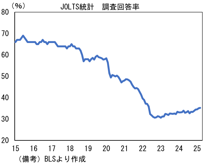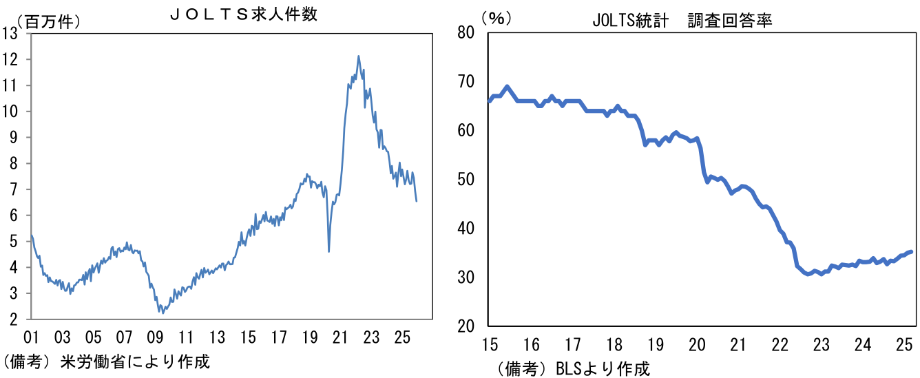 求人件数は前月比▲5.6%、654.2万件と、2020年央以来の低水準に落ち込んだ。調査回答率が低いことや、関連指標のIndeed求人指数が12月に上昇していることから、JOLTS統計全般の数値を額面通り受け止める必要はないと思われるが、それでも労働市場が軟化している可能性を意識せざるを得ない。