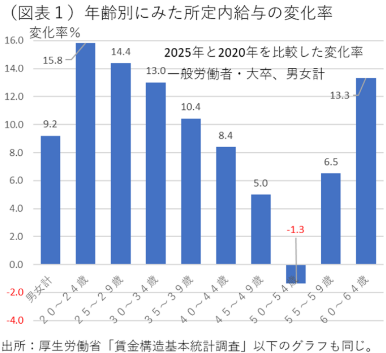 厚生労働省「賃金構造基本統計調査」(2025年<速報>、大卒・男女計・一般労働者)を使って、所定内給与の変化を調べると、20・30歳代の給与水準が5年前に比べて、10~16%も上がっていた(図表1)。初任給の引き上げを企業が相次いで実施し、それとバランスを取るかたちで、20・30歳代の年功賃金カーブの見直しが進んでいるからだ。背景には、若年世代での労働需給の逼迫がある。企業にすれば、新卒で入社した若手が次々と他社に転職してしまうと、その後なかなか中途採用では補充することが難しいという環境がある。だから、防衛的に若手の給与水準を引き上げようとするのだろう。