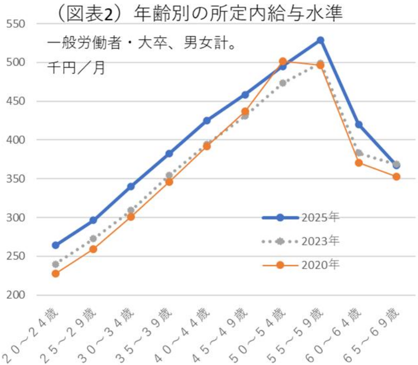 40・50歳代は、年功賃金カーブがどうなっているのかを時系列で遡って調べてみた。すると、2025年と2023年、2020年の所定内給与水準を比べると、やはり若年世代を中心に大幅に上がっていることがわかった(図表2)。5年前比でみて、55~59歳の所定内給与は増加していたが、これは年功賃金のピークが2020年の時は50~54歳だったのが、2025年の時は55~59歳へと後ずれした影響だと考えられる。バブル世代では50~54歳に給与水準のピークが来ていたのが、氷河期世代はそのタイミングが後ずれしている可能性がある。