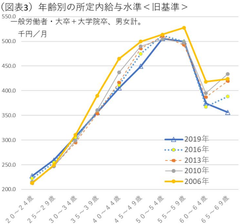 2019年以前のデータを調べると、40・50歳代は2006~2019年にかけて徐々に賃金カーブが押し下げられていた(図表3)。少し統計の事情が複雑なので細かく解説すると、原統計の見直しで2020~2025年にかけては2019年以前と連続性が断裂している(2019年までは学歴別区分が大卒+大学院卒、2020年以降の大卒だけの区分と異なる)。そこで、本稿では、2020年以降と2019年以前を分けて分析している。
