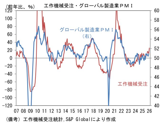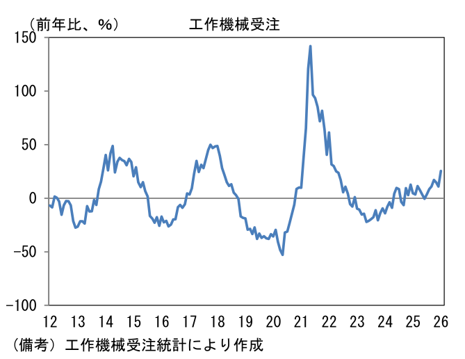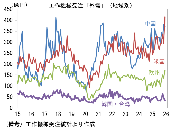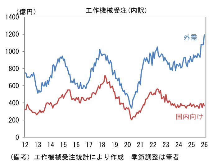 2月10日に発表された2026年1月の受注額(原数値)は1456億円であった。前年比では+25.3%とはっきりと伸び率は加速し、5ヶ月連続で2桁の伸びを達成した。筆者作成の季節調整値は前月比+6.0%と増加し、3ヶ月平均値では+2.0%と増加基調が強まった。単月の内訳は「国内向け」の季節調整済み前月比が▲6.9%と減少し、前年比でみても+2.0%と微増に留まった。企業の投資意欲はそれなりに強いものの、人手不足が足かせとなり、設備投資の進捗が遅々としていることが一因として考えられる。関連投資の機械受注に目を向けると、受注残高および手持ち月数が積み上がっており、これに伴って新規受注が抑制されている可能性が示唆される。この間、「外需」は前月比+10.6%、3ヶ月平均では+3.4%と力強く伸びた。前年比では+34.2%と明確に上昇。地域別詳細は確報を待つ必要があるが、12月までの傾向から判断すると中国と米国向けが増加基調を維持したとみられる。
