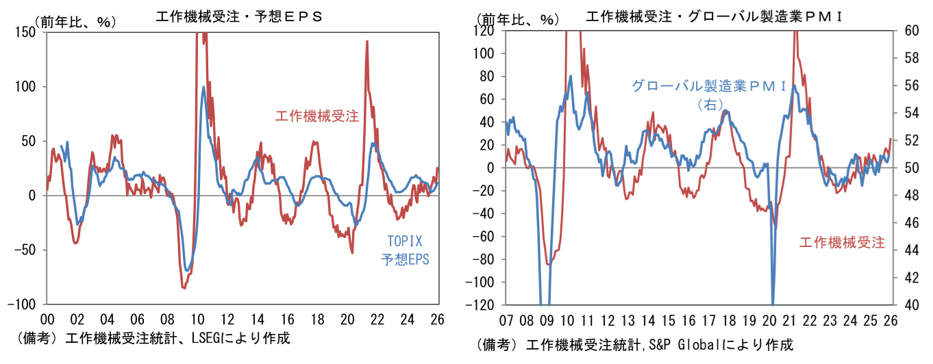 - 日本の工作機械受注は、そのサイクルがグローバル製造業PMIやアナリストの業績予想(TOPIX予想EPS)と連動性を有する。12月グローバル製造業PMIは50.9と好不況の分かれ目の目安とされる50を6ヶ月連続で上回った。通商政策の不透明感が後退する中、AIの爆発的需要に裏打ちされた新規受注の回復が継続し、世界的に景況感の改善がみられている。そうした下でTOPIXの予想EPSは円安と、企業の資本効率改善に向けた取り組みが奏功していることも相まって拡大基調を維持している。