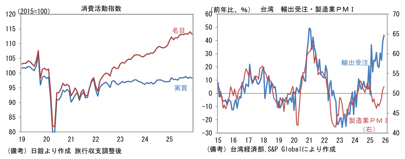 - 1月製造業PMIを地域別にみると、日本は51.5へと1.5pt上昇した。トランプ関税による直接的な影響が限定的なものに留まり、数量ベースの生産高が落ち込みを回避するなか、世界的なAI関連需要の拡大が続き、国内では個人消費が緩慢ながらも回復傾向にあり、生産活動は全体として緩やかに持ち直している。日銀が算出する消費活動指数は、実質値でみても緩やかな増加基調にある。この間、IT関連財の生産集積地である台湾は51.7へと0.8pt上昇し、2ヶ月連続で50を上回った。輸出統計との方向感相違は解消に向かっており、景況感の回復は広がりをみせている。韓国は51.2へと1.1pt上昇。メモリ価格が急伸するなか、大手メーカーは増産を急ぐと伝わっており、その波及効果が窺われる。