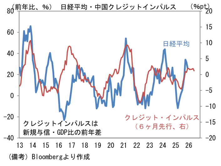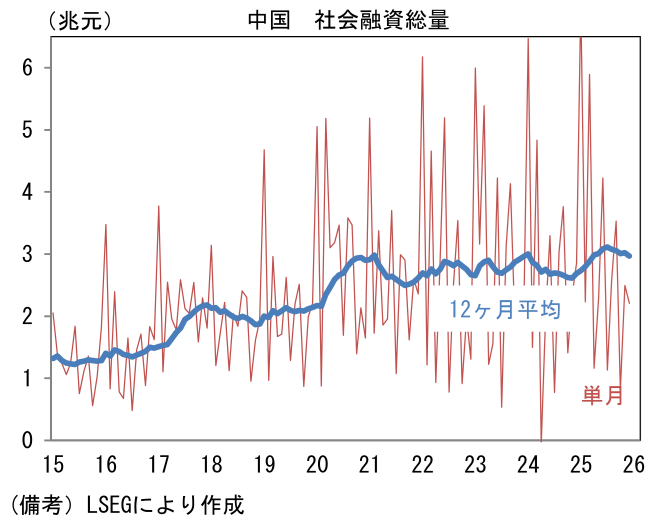 中国は50.3へと0.2pt上昇した。既往の不動産市況悪化とトランプ関税対策として、中国当局は景気対策を強化しており、一段の減速は回避されている。中国当局の政策態度を映じるとされるマネー関連統計に目を向けると、12月の社会融資総量(新規フローの12ヶ月平均値)は前月比▲1.8と減少し、残高は前年比+8.3%へと鈍化した。一方、新規融資のGDP比(前年差)をとった通称クレジットインパルスは+1.2ptとプラス圏で横這い状態となっている。この指標が日本株の先行指標として機能してきた経緯を踏まえると、現在の株高は一定の裏付けを伴っていると言える。
