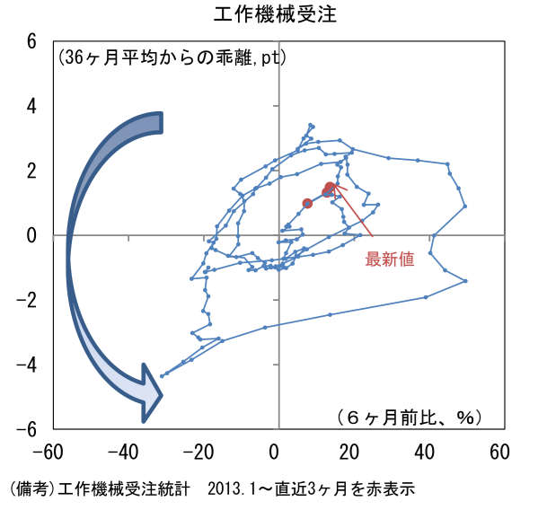 - 工作機械受注サイクルの位置取りを確認するために、縦軸に受注額の水準(36ヶ月平均値からの乖離)、横軸に方向感(6ヶ月前比)をとった循環図をみると、2025年央までは中心点付近で小さな渦を描いてきたが、過去数か月は右上領域に向けてはっきりと歩み出した。過去の経験則に従うなら今後も右上方向に進路をとると予想され、回復傾向がはっきりとしてくるだろう。これまで世界の株式市場はAIの頭脳として半導体関連銘柄を中心に物色してきたが、最近はハードとの融合である「フィジカルAI」に対する関心が広がっている。その場合、工作機械を中心に本邦製造業はロボット、FA(ファクトリー・オートメーション)など多くの関連業種を抱える。この見方が正しければ、工作機械受注は株式市場の有用な情報を与えてくれるのではないか。