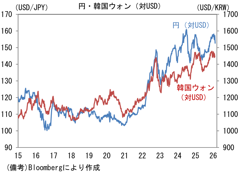 もちろん日本と韓国の株価について、それぞれ固有の要因が偶然同じ時期に発生した可能性はある。たとえば、韓国ではDRAM価格の急騰を受けてメモリ大手の収益が改善するとの期待が膨らむなど、半導体に関連した好材料があった。また、いわゆるKorea Discountの是正に向けてコーポレートガバナンスの機能改善が進捗するとの期待も膨らんだ。このように韓国に固有の材料があったことは確かであるが、ここで筆者が強調したいのは現在の株高・通貨安は日本に限定した事象ではないという事実である。金融市場の変動を何もかも「高市政権」で説明すると、経済政策の効果・リスクをそれぞれ誇張してしまう可能性がある。