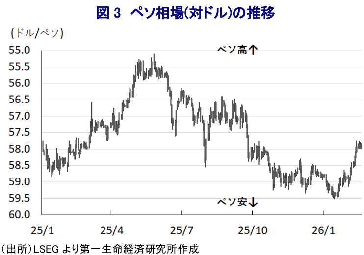 金融市場においては、中銀が利下げ局面の終了を示唆する一方、追加利下げに含みを持たせるなど、フォワードガイダンスの不明瞭さが意識される動きがみられた(注3)。一方、米ドル相場を巡っては、金融市場におけるFRB(米連邦準備制度理事会)の次期議長となるウォーシュ氏に対する見方に加え、米国経済に対する見方も交錯するなかで不安定な動きが続いている。こうしたなか、フィリピンの通貨ペソの対ドル相場は、足元における米ドル安の動きを反映して4ヶ月ぶりの高値となるなど持ち直しの動きをみせている。しかし、中銀が一段の利下げに含みを持たせる姿勢をみせたことは、景気の不透明感も重なり、先行きのペソ相場の重しとなる可能性に注意する必要がある。前述のようにフィリピン政界は混迷の度合いを強めるなか、サラ・ドゥテルテ=カルピオ副大統領は2028年に実施される次期大統領選への出馬を表明している。フィリピン政界では、マルコス家とドゥテルテ家の対立が先鋭化しており、2025年に実施された中間選挙は「代理戦争」であるとともに、大統領選の前哨戦とみられたなか、ドゥテルテ家は善戦した(注4)。したがって、サラ氏の次期大統領選への出馬は規定路線とみられる。なお、サラ氏を巡っては、議会下院に弾劾訴追されたものの、その後に議会上院が差し戻しを決定したほか、最高裁判所も手続きの不備を理由に違憲と判断するなど一旦は弾劾罷免の可能性は遠のいた。しかし、今月にサラ氏に対する新たな弾劾訴追が申し立てられており、弾劾訴追が行われる可能性がある一方、サラ氏はこれを否定している。政局の動きがペソ相場を左右する展開は想定されないが、マルコス政権の「死に体(レームダック)」化を加速させる可能性に加え、政策運営が景気に与える影響には注意が必要である。