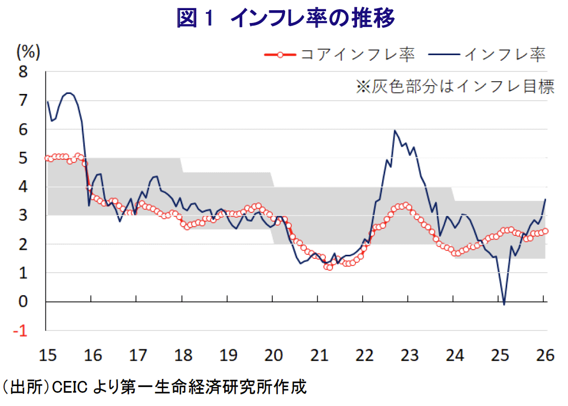 インドネシア銀行(中銀)は、2月18~19日の日程で開催した定例の金融政策において、政策金利である7日物リバースレポ金利を5会合連続で4.75%に据え置くことを決定した。中銀は2024年9月にコロナ禍一巡後初の利下げに踏み切り、その後も一時休止を挟みつつ2025年9月まで計6回、累計150bpの断続的な利下げを実施してきた。インドネシアでは、2023年半ば以降のインフレ率が中銀目標(2.5±1%)の範囲内で推移しており、上振れした物価が落ち着きを取り戻していることが中銀による利下げを可能にした。ここ数年、インドネシア中銀の政策目標に経済成長の支援が追加されるとともに、大統領による危機的事態宣言時に国債を直接購入する「財政ファイナンス」が認められるなど、政策運営に当たって景気重視の姿勢を強めざるを得ない状況にある。2024年に大統領に就任したプラボウォ氏は、任期中にインドネシアの経済成長率を8%と、過去数年の5%程度の成長から大幅に引き上げる方針を掲げている。こうした事情も中銀による利下げを後押ししたと考えられる。一方、1月のインフレ率は前年比+3.55%と2年半ぶりに中銀目標の上限を上回る伸びとなっているが、これは前年に時限措置として実施した電力料金引き下げによるベース効果の影響に留意する必要がある。とはいえ、当面はインフレが高止まりする可能性が高く、中銀は様子見姿勢を維持したと考えられる。