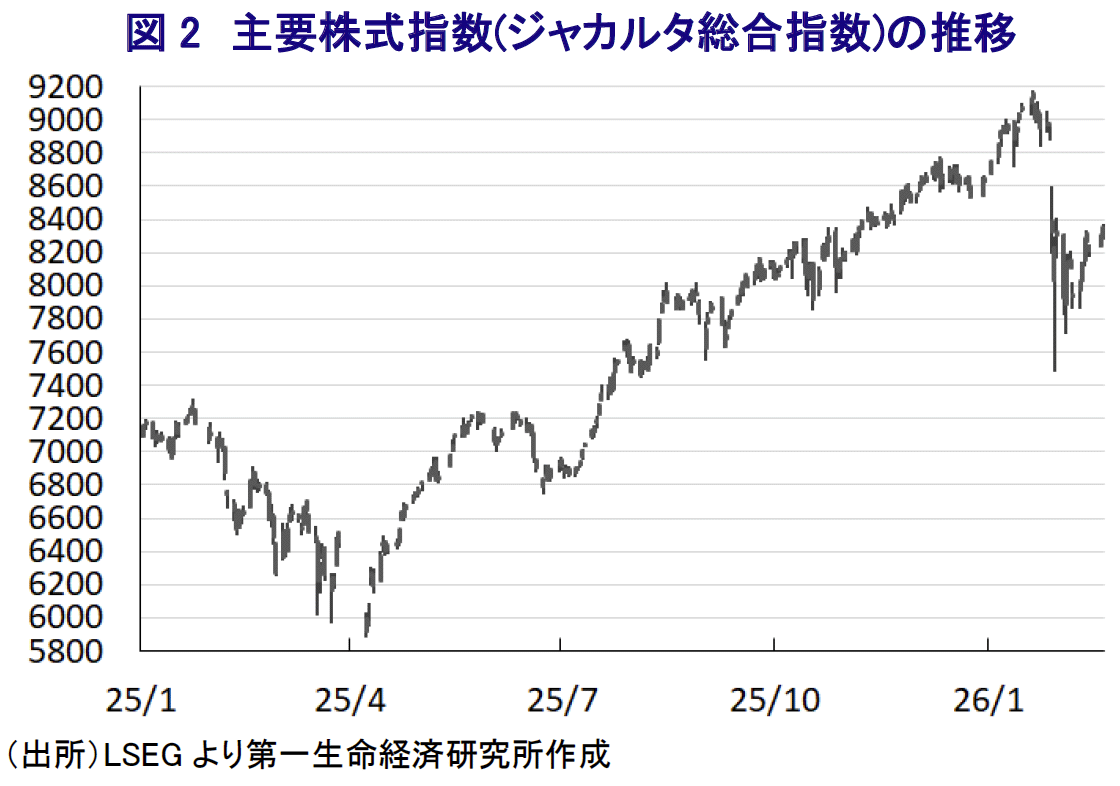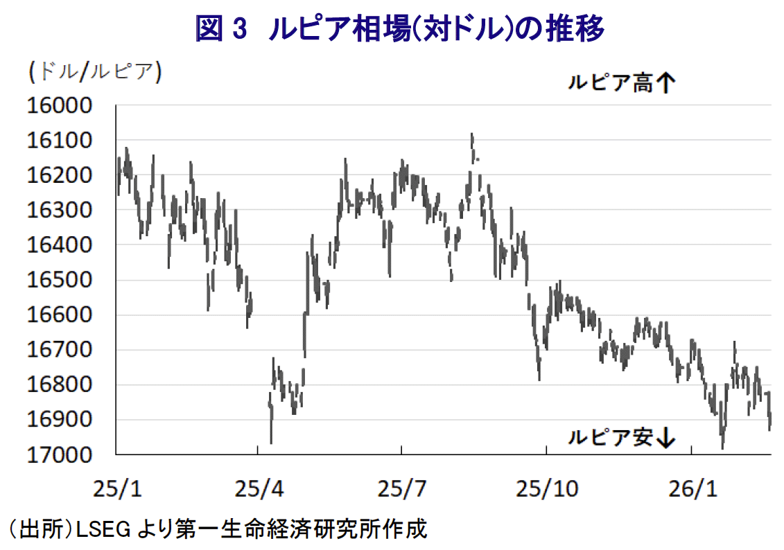 また、このところのインドネシア金融市場は、様々な要因が複合的に重なる形で混乱に直面している。プラボウォ大統領が主導するばらまき志向の強い財政運営を受け、2025年の財政赤字は695.1兆ルピア(GDP比2.92%)と法定上限(同3%)に近付くとともに、コロナ禍の影響を除けば約20年ぶりの赤字水準となるなど、財政状況が急速に悪化していることが明らかになった。さらに、1月に中銀のジュダ・アグン前副総裁が任期を1年余り残して突如辞任するとともに、後任にはプラボウォ大統領の甥で、財務副大臣を務めていたトマス・ジワンドノ氏が就任した。トマス氏はプラボウォ大統領の甥であることに加え、プラボウォ氏が党首を務める与党グリンドラ党の財務担当を務めていたため、この人事は中銀と政府、与党グリンドラ党との距離感に対する懸念につながっている。1月末には株式指数の算出・公表を行うMSCI社が株式市場の情報開示に関する懸念を表明したうえで、5月までに改善が確認されなければ、新興国株式指数におけるインドネシア株の比率引き下げ、フロンティア市場への格下げの可能性を示唆した。この発表を機に主要株式指数(ジャカルタ総合指数)が大幅に調整したことを受けて、政府は情報開示やガバナンス改革に取り組む方針を示しており、足元では一旦は落ち着きを取り戻している。しかし、その後も主要格付機関のムーディーズが政策の予見性低下がマクロ経済、財政、金融の安定性を毀損する懸念を理由に格付け見通しを引き下げるなど、将来的な格下げの可能性を示唆した(注1)。足元の通貨ルピアの対ドル相場は最安値近傍で推移するなど、資金流出圧力が強まっており、中銀の様子見姿勢を後押しした可能性もある。