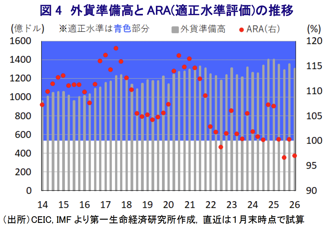 ペリー総裁は、追加利下げの可能性を残しつつ、慎重な姿勢を示した。通貨安定に向けて、米ドルへの過度な依存を避けるための人民元取引の拡大を表明するなど、ルピア防衛を図る姿勢を打ち出した。一方、足元では外貨準備高が減少しており、現在の水準は、IMFが示すARA(適正基準評価)に基づけば適正水準の下限を下回ると試算され、外部ショックに対する耐性が低下している。今後、政府と中銀が描く「成長ストーリー」が市場を納得させられるか、その舵取りには慎重さが求められる。