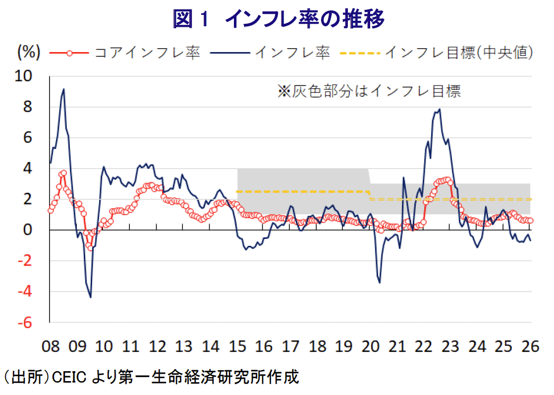 タイ銀行(中銀)は、2月24~25日の日程で開催した定例の金融政策委員会において、政策金利を25bp引き下げて1.00%とすることを決定した。中銀による利下げ実施は、2025年12月の前回会合から2会合連続となり、金利の水準も2022年11月以来の低水準となる。タイでは、2025年4月以降のインフレ率がマイナスとなっているうえ、コアインフレ率は2023年後半以降に中銀の定める目標(2±1%)の下限を下回る伸びで推移するなど、デフレ基調が続いている。こうしたことから、中銀は2024年10月にコロナ禍一巡後初の利下げに動くとともに、その後も断続的な利下げを実施するなど金融緩和を進めてきた。しかし、金利水準は周辺のASEAN(東南アジア諸国連合)諸国と比較して低水準にとどまるなど、追加利下げ余地が限られるため、中銀としては最も効果的なタイミングで金融緩和に動く考えを示してきた。こうしたなか、中銀としては連続利下げの実施により局面打開を図りたいとの思惑がうかがえる。