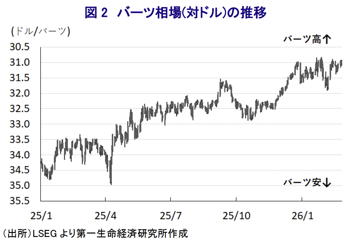 なお、2月8日に実施された総選挙では、アヌティン政権を支える最大与党・タイの誇り党が193議席を獲得し、改選前(71議席)から大幅に議席を積み増して勝利した(注3)。また、解散前に与党連立入りで合意した中道右派のクラ・タム党も58議席獲得して、改選前(0議席)から大躍進を果たした。その後の政党間協議を経て、総選挙で74議席と改選前(141議席)から大幅に議席を減らした「タクシン派」政党であるタイ貢献党も連立入りで合意している。よって、与党連立は安定多数となる300議席を上回るなど、ここ数年にわたって不安定な状況が続いた政局を取り巻く環境は大きく変化することが期待される。さらに、中銀のウィタイ総裁は2025年10月に就任したが、当初は過去に実施した利下げの効果を見定めるべく様子見姿勢をみせた。しかし、その後のタイ経済は景気に急ブレーキが掛かるとともに、隣国カンボジアとの対立、南部を直撃した洪水被害、バーツ高という「四重苦」に直面しており、金融緩和に舵を切った。そして、今回の定例会合の直前に開催されたビジネスセミナーでは、タイ経済は全体として安定しているものの、成長率が低水準にとどまるなか、広範囲に財政、金融の政策連携を進めることにより成長率を押し上げることが必要と述べた。そのうえで、現時点における中銀見通しでは、2026年の経済成長率は+1.9%となっているが、これを+2.7%に押し上げることを目標に掲げる考えを示した。したがって、今回の中銀の決定はウィタイ総裁のこうした見方に沿ったものと考えられる。