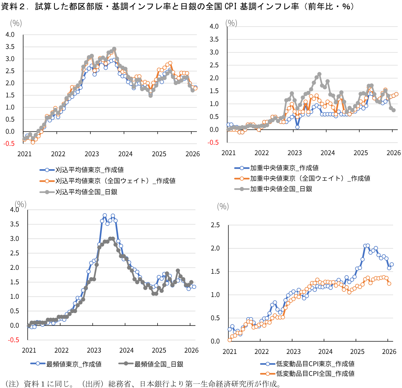 以前のレポートで試算した①東京都区部版の基調的インフレ率3指標、②日銀が賃金から物価への波及度合いを分析する際に利用した低変動品目CPIについて、本日公表の2月都区部CPIを用いて計算した。