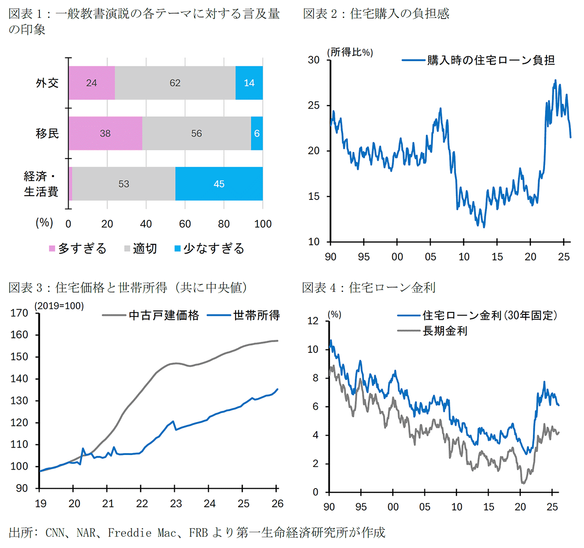11月の中間選挙における重要な論点が「アフォーダビリティ(生活のゆとり)」となるなか、トランプ政権は経済対策のアピールに重点を置いている。一般教書演説後のCNN世論調査によると、トランプ氏の演説を評価する視聴者は64%に達した一方、経済と生活費への言及が「少なすぎた」との回答が45%に達するなど(移民問題:同6%、外交:14%)、米国民による経済対策への関心は高い(図表1)。