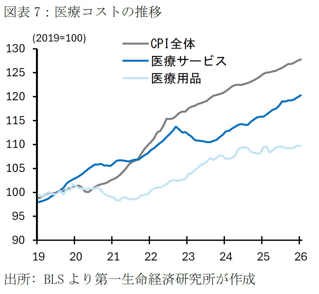 家計の負担感を補足するCPI上の医療費動向をみると、医療サービスや医薬品は全体を下回る伸びとなっている(図表7)。ただ、そもそも米国は医療が割高な国である。例えば2024年における医療支出のGDP比をみると、米国は17.2%と、OECD平均の9.3%(日本:同10.6%)を大きく上回っている。足下の価格高騰が緩やかでも、その水準を踏まえると米国民の医療支出への負担感は強いだろう。