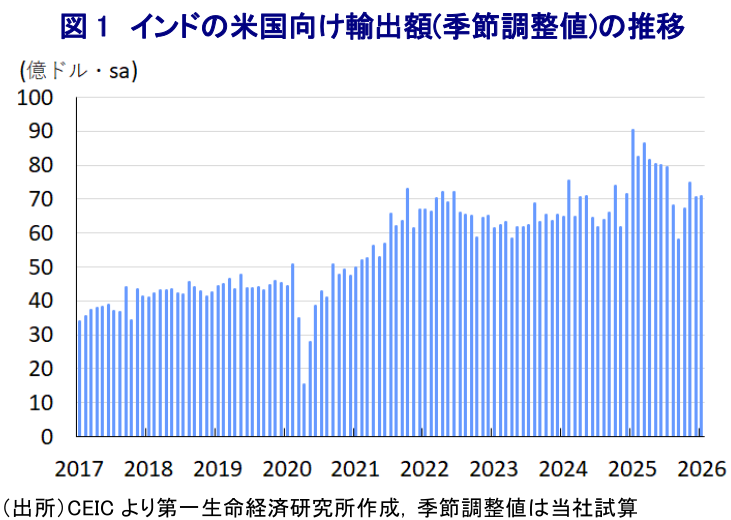 インドは、新興国のなかでも経済構造面で外需依存度が相対的に低いうえ、対米輸出額は名目GDP比で2.2%程度にとどまるため、いわゆる「トランプ関税」によるマクロ面での直接的影響は限定的と見込まれる。しかし、インドの輸出全体に占める対米比率は2割にのぼるなど、輸出先としての米国への依存度は高いため、輸出関連産業を中心に悪影響が出ることは避けられない。トランプ米政権は2025年8月、インドがロシア産原油の輸入を拡大させたことに対する「ペナルティ」である二次関税を発動したため、同国に対する関税は50%(相互関税(25%)+二次関税(25%))となった(注1)。なお、米国は関税の対象外とする品目を設定、インドの対米輸出のうち半分以上は対象外とされた。こうした状況ではあるものの、2025年末にかけての対米輸出額は頭打ちとなっており、トランプ関税は少なからず景気に悪影響を与えていることが確認された。