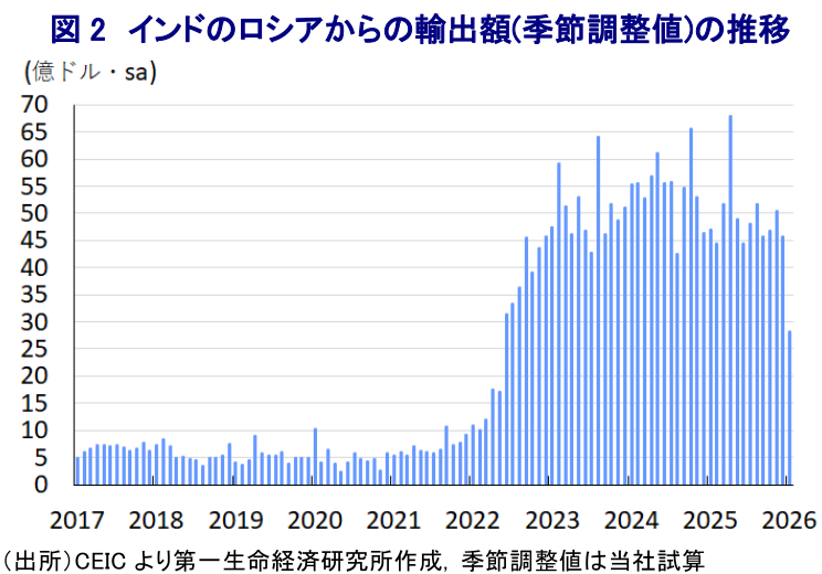 2月2日にインドのモディ首相とトランプ氏は電話会談を行い、直後にトランプ氏は、米国がインドに課す関税を18%に引き下げることで合意したことを明らかにした(注2)。両者は2025年10月にも交渉を行っていた模様であり、その際にトランプ氏はモディ氏がロシア産原油の輸入停止を保証した旨を明らかにするなど、関係改善に向けた兆しがみられた。しかし、その後もインドのロシアからの輸入額は高水準で推移、2025年12月にはロシアのプーチン大統領が4年ぶりにインドを訪問した。また、インド政府高官は米国との合意が近いとの見方を度々示したものの、そうした動きが一向にみられないことで事態の膠着化が懸念された。一方、米国によるベネズエラへの軍事行動を経て、ベッセント米財務長官やトランプ氏は、インドがロシア産原油の減少分をベネズエラ産原油の輸入拡大により補うことで合意したと明らかにし、関係改善をうかがわせる動きがみられた。1月末にはインドとEU(欧州連合)が自由貿易協定(FTA)締結交渉で最終合意に至るなど、いわゆる「米国外し」につながる動きも顕在化した(注3)。こうした事情も、米国にインドとの交渉を前進させる一因になった可能性がある。米印両国の合意発表直後に米国はインドに課した二次関税を撤廃しており、インドがロシアからの輸入を大幅に減らす動きも確認されている。ただし、米連邦最高裁が相互関税を違憲とする判断を下したほか、米国政府も停止したことを受けて(注4)、米印の追加協議は延期されており、関税の行方には不透明感が高い。とはいえ、米国による二次関税撤廃が対米輸出のハードルを下げることが期待される。