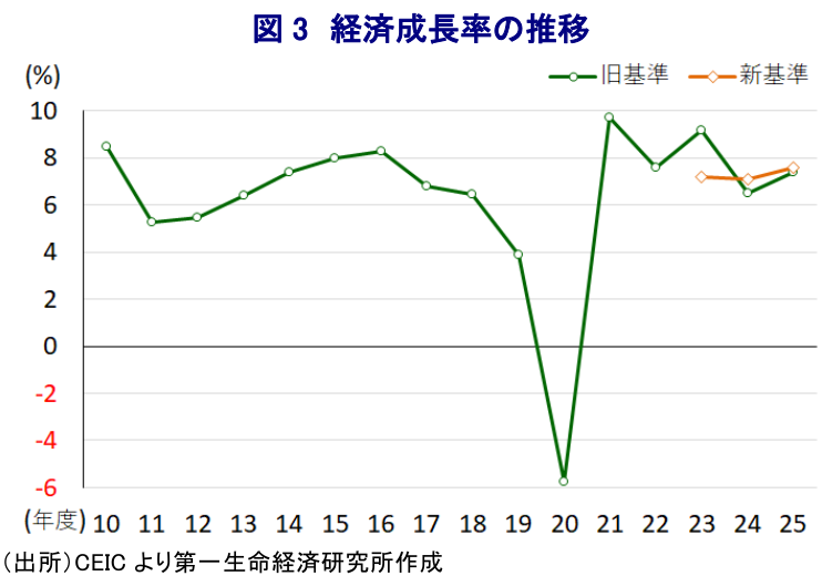 一方、モディ政権は、トランプ関税による外需への悪影響を軽減すべく、2025年9月末からGST(財・サービス税)の合理化による事実上の引き下げを通じた内需喚起に動いた。その後のインフレは下振れしたほか、RBI(インド準備銀行)も2025年12月の定例会合で一段の利下げを実施するなど、成長のけん引役である個人消費など内需を下支えする姿勢をみせた。2025年10-12月の実質GDP成長率は前年同期比+7.8%と高い伸びが続いていることが確認されている。なお、インド政府(統計・計画実施省)は今回の統計公表からGDPの基準年を2022-23年度に改定し、新たなデフレーターの採用による統計精度の向上を図ったとしている。具体的には、これまでは卸売物価を元に約180品目を対象としていたものの、新基準では卸売物価と消費者物価を合わせて500~600品目に拡大し、実質成長率の過大算出の懸念に対応したとしている。背景には、2025年11月にIMF(国際通貨基金)が、インドの国民経済計算の算出方法を巡る脆弱性に懸念を表明したことがある。ただし、今回の基準改定では過去4年分のみが新基準で算出されており、過去との比較に際しては統計基準を巡る連続性の問題を抱える。結果、2023-24年度の成長率は新基準で+7.2%と旧基準(+9.2%)から▲2.0ptと大幅に下方修正される一方、2024-25年度は+0.6pt、2025-26年度(見通し)も+0.2pt上方修正された。これは、2024年に実施された連邦議会下院(ローク・サバー)総選挙直前の2023-24年度の経済成長率を実態に比べて過大に算出する形で良好な景気をみせた後、「後出しじゃんけん」的に実態に合わせて下方修正した可能性は否めない。モディ政権が実施した統計の基準改定を巡っては、2019年の総選挙直前に過去に遡って再計算が行われ、シン前政権下の経済成長率が軒並み下方修正されるなど、統計の恣意的運用に疑義が呈されたことがある。今回の基準改定に関する評価については、過去に遡る形で修正が行われて統計の連続性を巡る問題が解消される状況を待つ必要はあるものの、今後の動向を注視することが必要である。