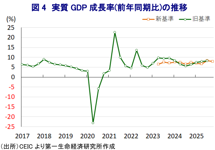 - モディ政権はGSTの実質引き下げで内需喚起を図り、RBIも利下げを実施した結果、2025年10-12月の実質GDP成長率は前年同期比+7.8%と高成長が続く。一方、インド政府はGDPの基準年を改定し、統計精度の向上を図ったが、2023-24年度の成長率の大幅下方修正は、2024年の総選挙前に成長率を過大算出していた可能性を示唆する。過去にも統計の恣意的運用への疑義があり、動向を注視する必要がある。