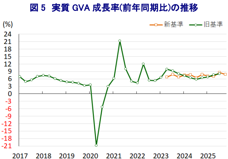 インドでは、GDPを算出するための基礎統計が整備途上にあり、長らく供給サイドの統計であるGVA(総付加価値)が重視される傾向があり、景気実態を測る観点では実質GVA成長率の動きをあわせてみる必要がある。今回の統計改定に際しては、GVAの内容もあわせて改定されており、2025年10-12月の実質GVA成長率は前年同期比+7.8%と前期(同+8.6%:新基準)から鈍化したものの、GDP同様に7%を上回る高い伸びが続いている。当研究所が試算した季節調整値に基づく前期比年率ベースの成長率はプラス成長で推移しているものの、二桁%の高い成長となった前期の反動も重なる形で伸びは鈍化している。分野ごとの生産動向をみると、前期にマイナス成長となった農林漁業関連の生産がプラスに転じるとともに、鉱業部門の生産も加速するなど、足元の景気を下支えしている様子がうかがえる。また、輸出の堅調さや個人消費の旺盛さは製造業の生産を下支えしたほか、サービス業も幅広く拡大する一方、設備投資意欲の後退は建設業の急減速を招いている。
