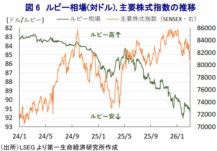 先行きのインド経済を巡っては、米国との通商合意に加え、2026年1月にはEU(欧州連合)とFTA(自由貿易協定)締結に向けた基本合意など、外需を取り巻く環境の改善が期待される状況にある。さらに、4月からの2026-27年度予算案についても、インフラ投資の大幅拡充のほか、製造業振興、農村支援、雇用創出など総花的な内容ではあるものの、景気下支えを重視する方針が示された。こうした動きは、外部環境の改善に加え、インフレ鈍化やRBIによる利下げなど内需下支えに向けた動きも重なり、当面の景気を押し上げることが期待される。しかし、短期的には中東情勢の不透明感が強まるなか、国際原油価格は大きく上振れする動きをみせており、原油を海外からの輸入に依存するインド経済に逆風が吹くことは避けられない。インドと米国は、インドがロシア産原油の輸入を減らす一方、ベネズエラ産原油の輸入で代替することで合意しているものの、ベネズエラの産油量の回復は道半ばであり、当面は中東からの輸入拡大により代替せざるを得ない。イランはホルムズ海峡において米英などの石油タンカーをミサイル攻撃するなど事実上の封鎖に動いており、1日の原油供給量の約2割が通過する同海峡の封鎖は、国際原油価格の高止まりを招く可能性が高まっている。結果、金融市場においては原油価格の高騰に伴う対外収支の悪化を警戒してルピー相場に調整圧力がかかるとともに、主要株式指数(ムンバイSENSEX)も上値が抑えられる動きがみられるなど、堅調な景気が確認されるなかでも厳しい展開が続く可能性に注意する必要がある。