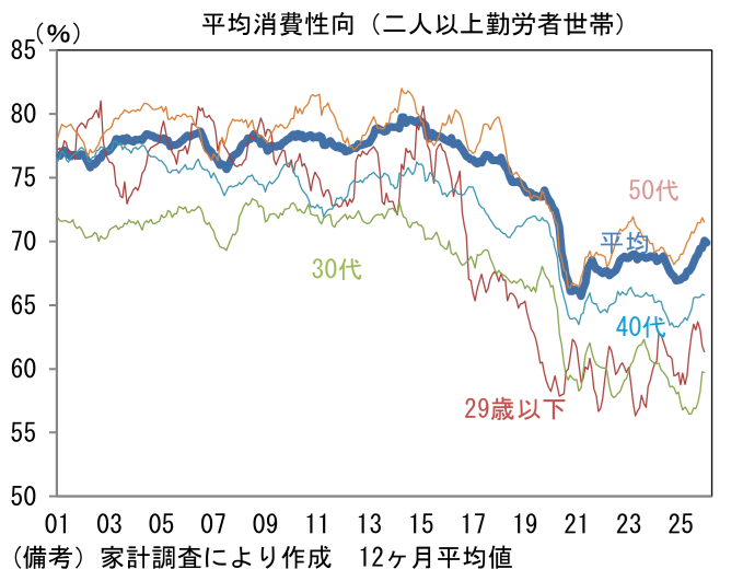 事実、2023年~2025年央においては、所得の増加に伴って平均消費性向が低下した。振れの大きい家計調査を基に算出しているため幅をもって解釈する必要があるが、この裏には「賃上げは一時的なので消費はせず貯蓄・投資に回そう」という消費者行動が浮かび上がる。巷ではNISA貧乏という造語も誕生し30代以下の層を中心に、投資を優先して消費を後回しにする消費者行動が注目された。