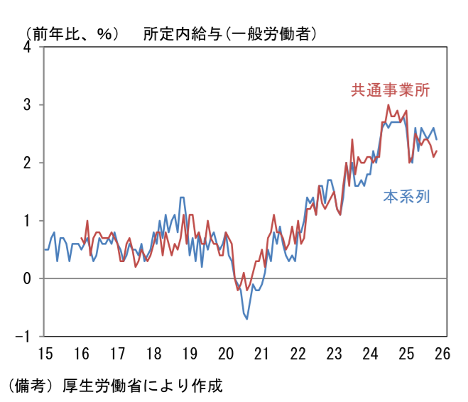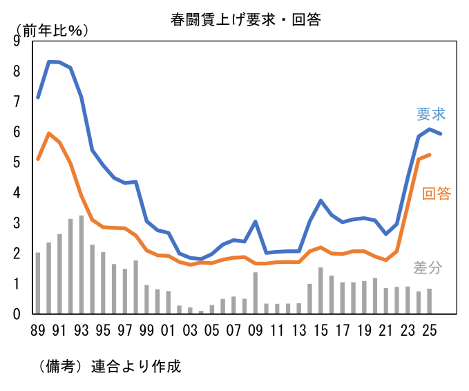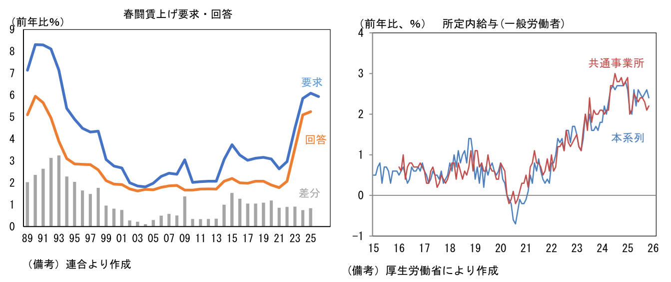- 春闘賃上げ率は2026年も5%を超える見込みである。3月5日に連合が公表した賃上げ要求率は5.94%となり、2025年の6.09%をやや下回るものの、2024年の5.85%を上回る結果となった。労働組合の要求と実際の賃上げ率には一定の差異があることから、2025年の差異を基に2026年の賃上げ率を計算すると、5.1%程度となった。ここから判断すると、日本の一人あたり賃金を示す最も代表的な指標である、毎月勤労統計における一般労働者の所定内給与の伸びは現在の水準かそれ以上と想定される。春闘賃上げ率(要求段階)が加速するわけでもないのに「それ以上」としたのは、毎月勤労統計調査は特定の業種におけるサンプル要因から賃金の実勢を過小評価している可能性が指摘されているからである。仮にサンプル要因であるならば、2024年後半の基調である3%程度への再加速が見込まれる。