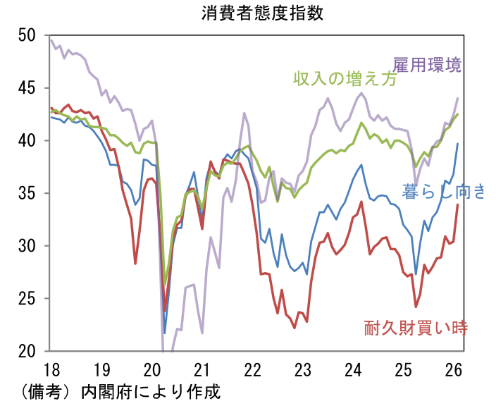 - こうした賃上げ機運の高まりもあってか、3月4日に発表された消費者態度指数は40.0へと2.1pt上昇した。3ヶ月平均値は9ヶ月連続の上昇であり、内閣府は基調判断を「改善に向けた動きがみられる」に上方修正した。背景にあるのは、ガソリンの旧暫定税率の廃止もあって物価上昇に一服感がみられていることであろう。購買頻度が高く、食生活を営む上で重要なお米の値段が落ち着いてきたことも寄与したとみられる。またトランプ関税の影響が昨春に懸念されたほどの打撃となっていないことも大きいとみられる。