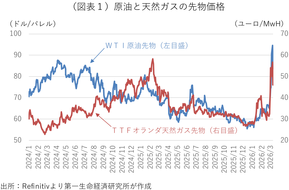イランが2日にホルムズ海峡を封鎖して以来、600隻以上の船がペルシャ湾内での滞留を余儀なくされ、海峡を通過した商船は僅か数隻にとどまる。同海峡は世界の原油・石油製品の約2割に相当する日量2000万バレルが通過するエネルギー供給の要衝だ。通航制限が長期化すれば、原油・ガス価格の上昇は避けられない。海峡封鎖や石油関連施設への攻撃継続で供給制約が長期化するとの見方から、原油価格は9日の取引時間帯に一時、ロシアによるウクライナへの侵攻開始後の2022年7月以来で初の1バレル=100ドルを突破した(図表1:終値ベース)。「戦闘終結が近い」とするトランプ大統領の発言が伝わり、80ドル台前半まで低下したが、原油市況はその後も神経質な展開が続いている。11日には国際エネルギー機関(IEA)の加盟国が過去最大規模となる4億バレルの石油備蓄の協調放出を決めたが、原油価格は80ドル台後半で高止まりしている。備蓄放出には時間が掛かるうえ、計画の全量を放出した場合も海峡通過分の約20日分をカバーするに過ぎない。同日にはイランがホルムズ海峡に機雷を敷設する準備を開始したとの報道も伝わり、通航制限が長期化するとの懸念が払拭できない。米国や欧州がペルシャ湾に海軍を派遣し、ホルムズ海峡を通過する商船を護衛する計画も浮上しているが、海峡の安全確保につながるかどうかは予断を許さない。備蓄の放出や護衛が開始されれば、原油価格の上昇をある程度抑制する要因になり得るが、持続的な価格安定にはホルムズ海峡の封鎖が解除され、原油供給が再開される必要がある。