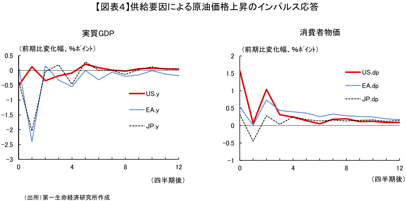 注3) 星野(2026)(https://www.dlri.co.jp/report/macro/580935.html)では、マクロモデルを用いて、同程度の原油価格ショックが日本経済に与える影響を試算し、ショックから1年後の実質GDPへの影響は、ベースライン対比で▲0.21%という結果を得ている。本稿の試算結果の方が下押し幅が大きくなっているが、理由としては、GVARによる試算は、原油高による直接的な国内の所得流出効果に加え、欧州や中国など主要な貿易相手国が同時に景気後退に陥ることによる「輸出(外需)の連鎖的な減少」というグローバルな波及効果をモデルが内生的に捕捉しているためだと考えられる。