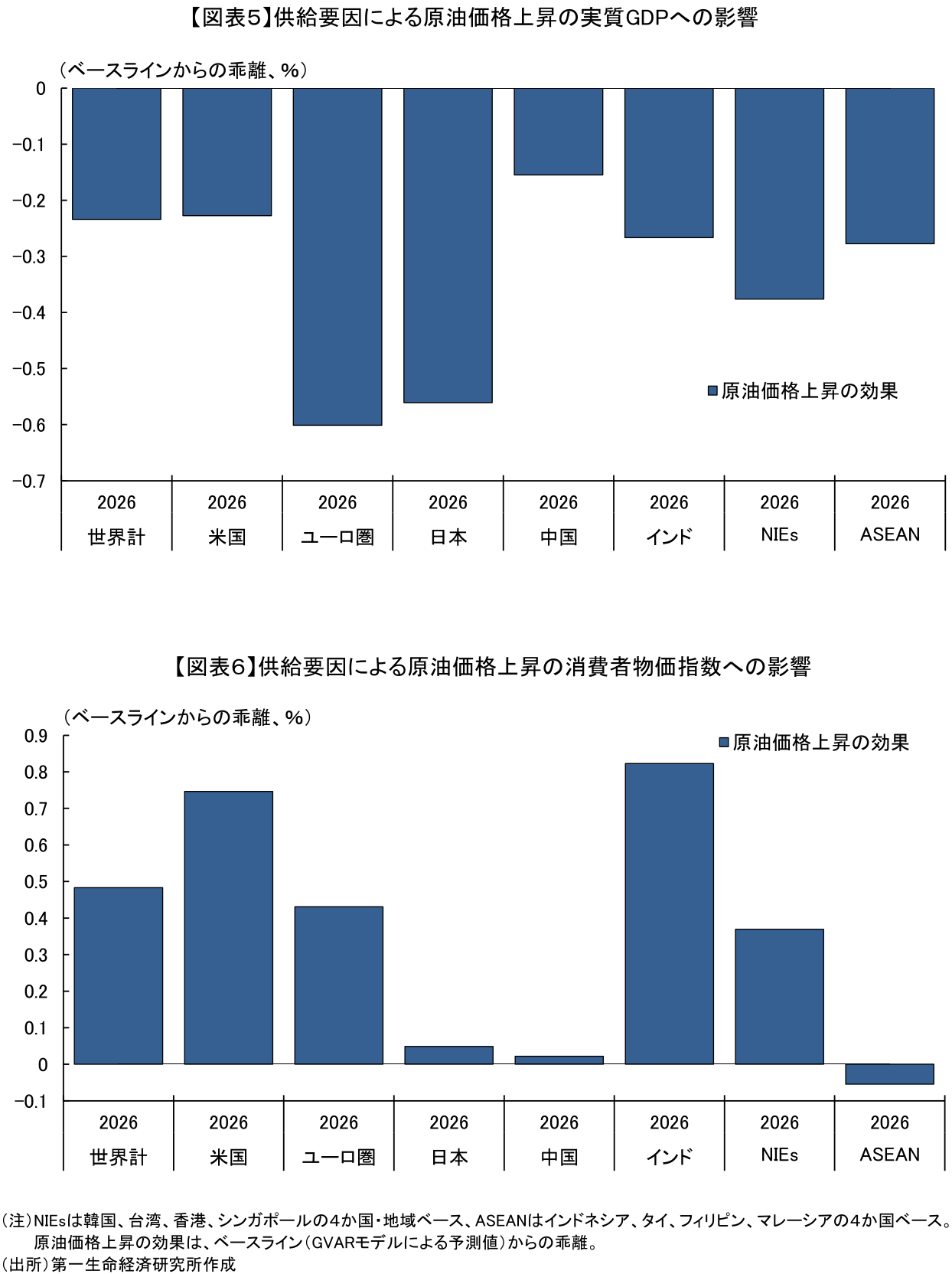 図表5および図表6は、2026年1Qに生じた供給要因による原油価格の急騰(+33%)が、2026年の各経済圏の年間実質GDPおよび消費者物価指数に与えるトータルの影響を、ベースライン(ショックがなかった場合の予測値)からの乖離幅として定量化したものである。2026年の実質GDPに対する影響を見ると、世界全体で約▲0.2%強の下押し圧力がかかる中、とりわけユーロ圏(約▲0.6%)と日本(約▲0.5%)が最も深刻なダメージを受ける構図が浮き彫りとなっている(注3)。エネルギーの純輸入国である両地域は、直接的な交易条件の悪化に加え、世界的な需要減退による外需の下振れという二重の下押し圧力を被りやすい。また、輸出主導型のNIEs(約▲0.4%)も、グローバルなサプライチェーンの停滞を通じて相対的に大きなマイナス影響を受ける。対照的に、米国と中国の成長下押し幅は▲0.2%前後に留まっている。米国は世界最大の産油国としてのエネルギーセクターの収益拡大が個人消費の落ち込みを一部相殺するバッファーとして機能し、中国は中東以外の地域の割安な原油調達がショックの波及を緩和している可能性がある。