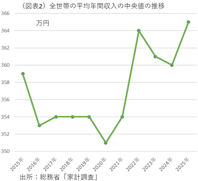最近の所得分布については、総務省「家計調査」(総世帯)の世帯年収分布から把握することができる。その中で、暦年ベースで2025年までの年間収入十分位が細かく発表されている。このデータを補完的に使えば、格差の状況がいくらかわかる。
