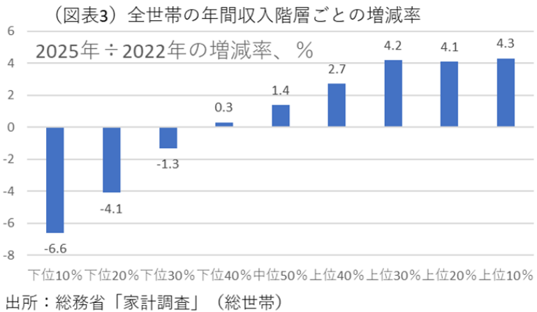 まず、平均的な家計収入として中央値がどう推移しているかを時系列でプロットしてみた(図表2)。すると、ここ4年くらいは収入増が目立っていた。過去を遡ると、10年前から2021年までは、世帯収入の中央値はほぼ横ばいだったのが、2022~2025年にかけては上昇がみられる。2022~2025年の所得分布で、十分位ごとの年収水準の増減率を計算すると(すなわち累積ではない)、間接的に分布の変化が把握できる(図表3)。その結果は、上位10~30%のところでは、比較的上昇率が大きかった。中高所得世帯では収入が増えているようだ。この上昇は、企業の業績拡大を受けて、役員報酬が大きく増えたことや、中堅以上の勤労者の給与水準(年収400万円以上)が増えたことが考えられる。対照的に下位10~30%はこの期間は減少している。中高所得世帯と低所得世帯の間にコントラストがあることは、過去数年の特徴と言える。中高所得世帯の収入増は、賃上げが進んだ恩恵と言える。下位10~30%の世帯は、勤労者以外の世帯が多く、彼らの年間収入はあまり増えなかったことを暗示している。