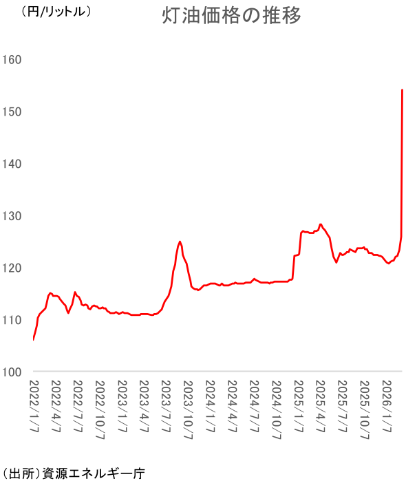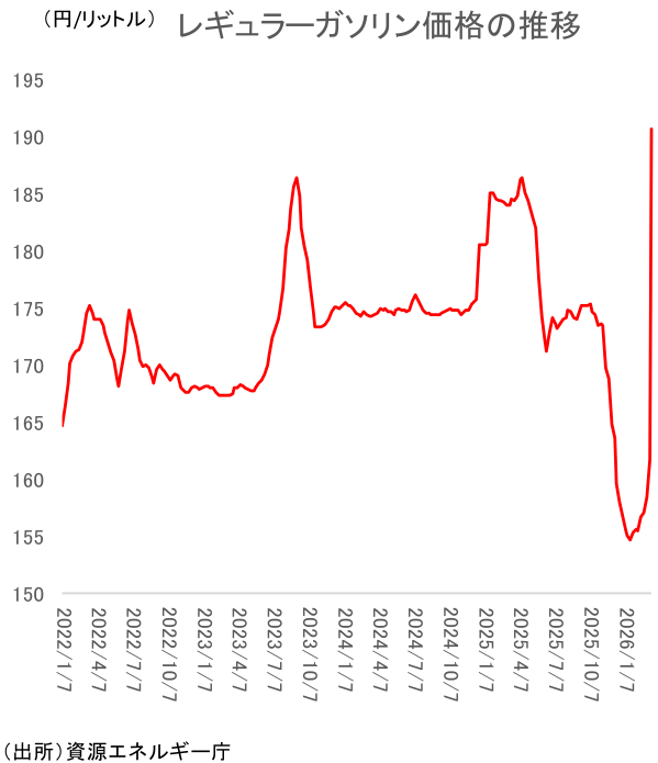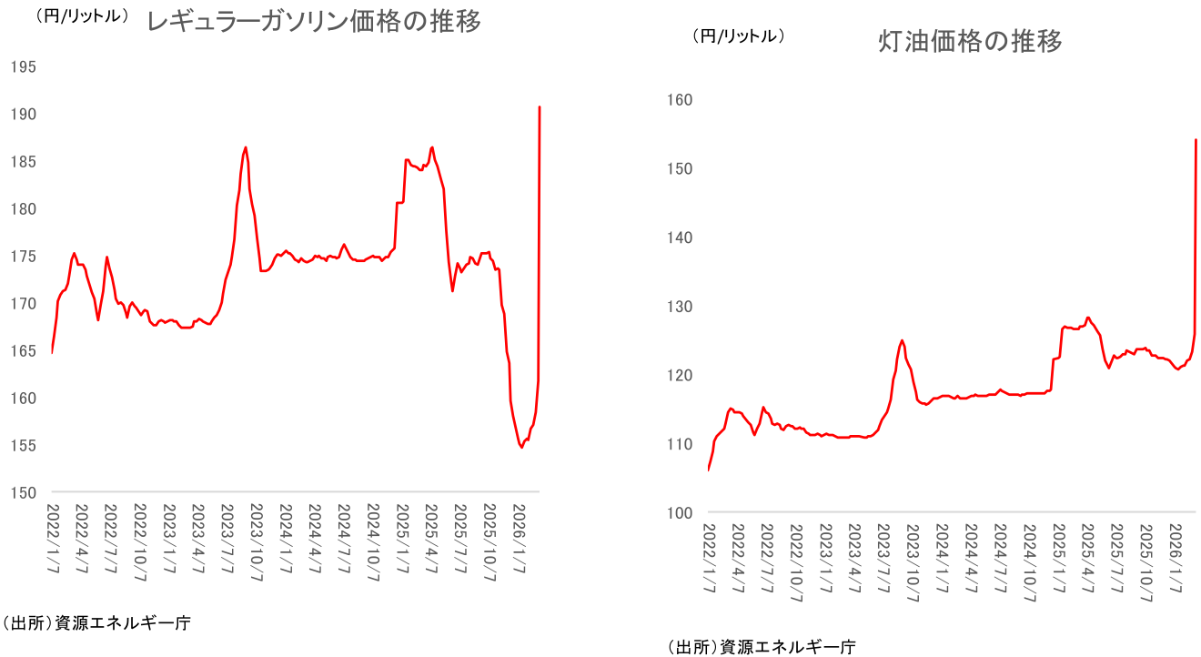 資源エネルギー庁によると、レギュラーガソリンの店頭価格(全国平均、16日時点)は190.8円/ℓと、前週の161.8円/ℓから29.0円もの値上がりとなった。これは調査開始以来の最高水準であり、都道府県別で最も高かった山形県では198.5円/ℓと200円/ℓに迫っている。また、灯油価格も154.1円/ℓと、前週の125.9円/ℓから28.2円の上昇となっている。イラン情勢悪化に伴う原油価格の急騰が反映された格好だ。