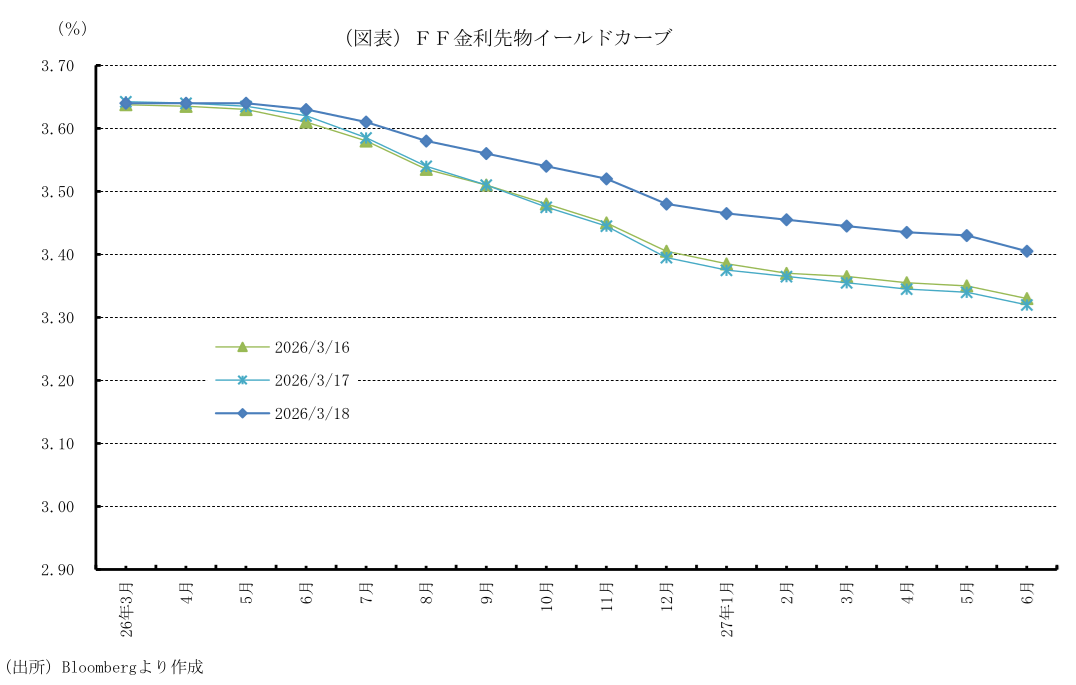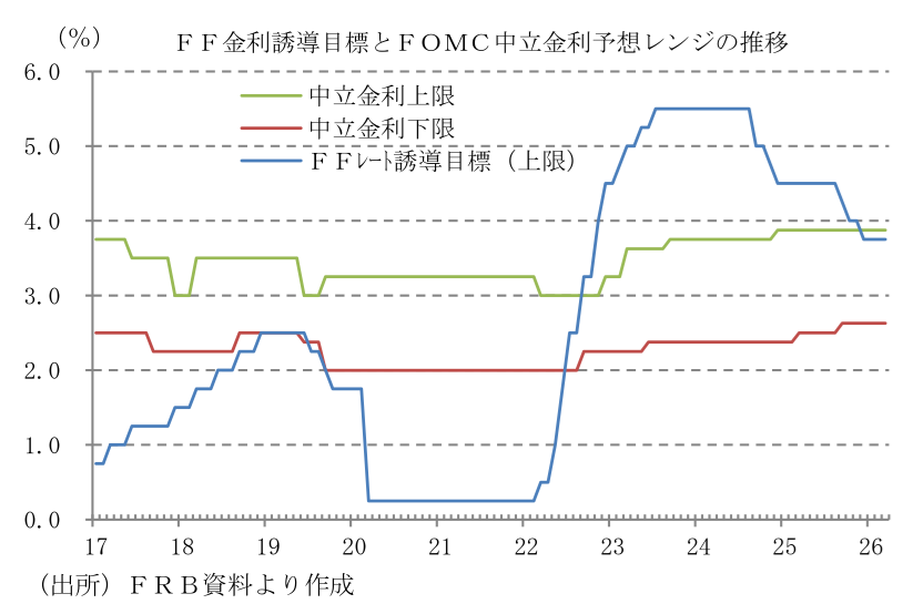 26年3月17、18日に開催されたFOMCで、FRBはFFレート誘導目標レンジを予想通り2会合連続で3.50~3.75%に据え置くことを賛成11人、反対1人の賛成多数で決定した。ミラン(マイラン)FRB理事は「25bpの利下げ」が適切として据え置きに反対した。前回利下げを主張し据え置きに反対したウォラーFRB理事は、次期FRB議長に指名されなかったことを受け、今回は多数派の意見に合わせた模様。