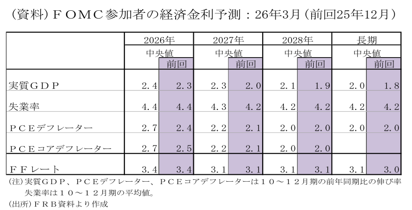 声明文と同時に公表された26年3月のFOMC参加者の経済・金利予測中央値(10-12月期の予測)で、26年の実質GDP成長率は前年同期比+2.4%(12月:同+2.3%)、27年同+2.3%(同+2.0%)、28年+2.1%(同+1.9%)、長期+2.0%(同+1.8%)と軒並み上方シフトした。これらは、生産性の向上を考慮した結果とされた。
