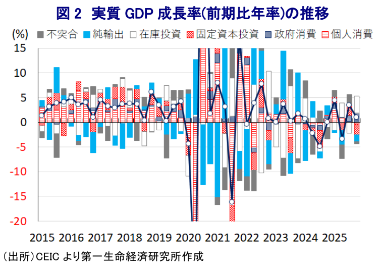 金融引き締めや中国の景気減速を背景に2024年半ばにはテクニカル・リセッションに陥ったが、その後の景気は回復の兆しがみられた。2025年10-12月期の実質GDP成長率は前期比年率+1.0%と2四半期連続のプラス成長を維持した。しかし、個人消費・設備投資・不動産投資はいずれも弱く、成長は公的需要と在庫積み増しに支えられた部分が大きい。したがって、景気の実態は数字以上に厳しい状況にある。