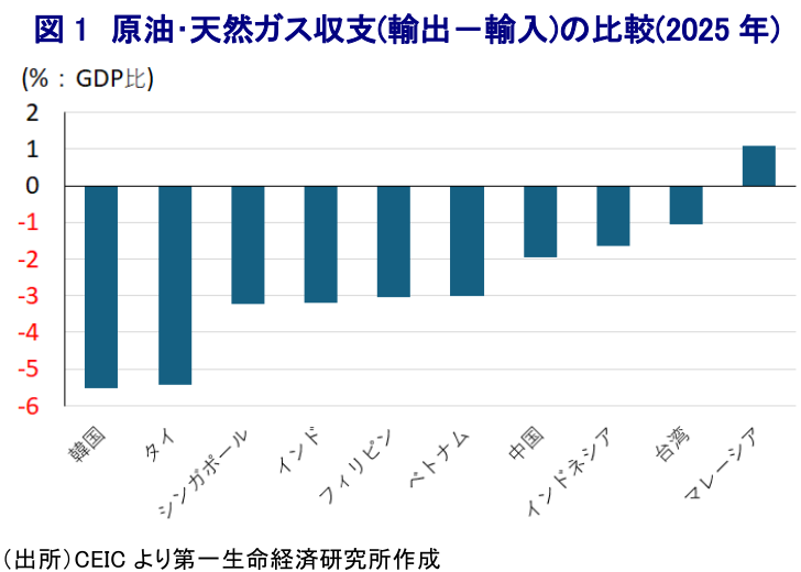 - アジア新興国では、近年の経済成長も追い風にエネルギー消費が拡大しており、マレーシアを除く主要国で原油と天然ガスの収支は赤字であるうえ、中東への依存度が高い。イランによるホルムズ海峡の事実上の封鎖により調達コストが上昇するなか、中東産原油価格はWTIや北海ブレントを大きく上回っており、アジア新興国への悪影響が特に大きくなるとの見方が投資家心理を冷え込ませていると考えられる。