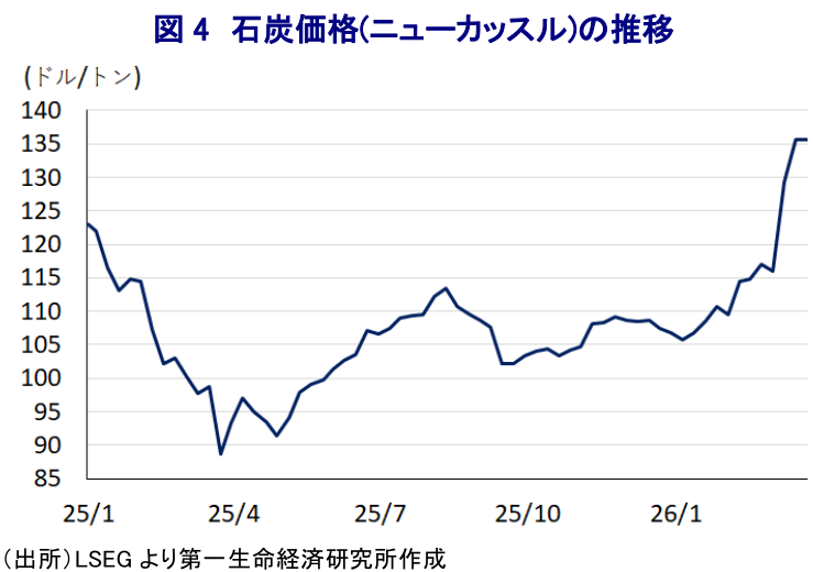 アジア新興国については、1次エネルギーに占める石炭への依存度が比較的高い国が多く、そうした国においては原油や天然ガス価格の上昇による影響を受けにくいとの見方がある。IEA(国際エネルギー機関)によれば、2024年時点における中国の1次エネルギーに占める石炭比率は60.9%と、他のアジア新興国のなかでも突出しているほか、インド(46.4%)も比較的高水準となっている。一方、アジア新興国のなかで原油や天然ガス収支の赤字幅が比較的大きい韓国やタイ、シンガポールについては、1次エネルギーに占める原油や天然ガスの割合が比較的高く、これらの国々においては価格上昇による影響が出やすい特徴を有する。また、アジア新興国のなかには、原油の戦略備蓄量がベトナム(15日)やインドネシア(20日)のほか、フィリピン(60日)、タイ(61日)、インド(74日)など1~2ヶ月程度と小規模にとどまる国が多く、すでに枯渇が懸念される国も出ているほか、中東情勢の緊迫が長期化した際の影響深刻化は避けられない。IEAは3月11日、原油価格の高騰に対応することを目的に、過去最大となる4億バレル規模の原油備蓄を放出することで合意したほか、その後も必要に応じて追加放出に動く方針を示している。しかし、その後も中東情勢に改善の兆しがみられず、原油価格は高止まりしており、効果は見通せない状況が続いている。そのうえ、足元では原油や天然ガスに比べて落ち着いた推移をみせてきた石炭価格も上昇しており、1次エネルギーに占める石炭比率が比較的高い国にも影響が伝播する可能性が高まっている。よって、1次エネルギー比率の動向にかかわらず、アジア新興国全体としてエネルギー価格の上昇圧力が強まる懸念が高まっており、こうした事情もアジア新興国への悪影響が広がるとの見方につながっている。