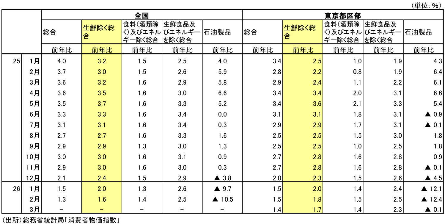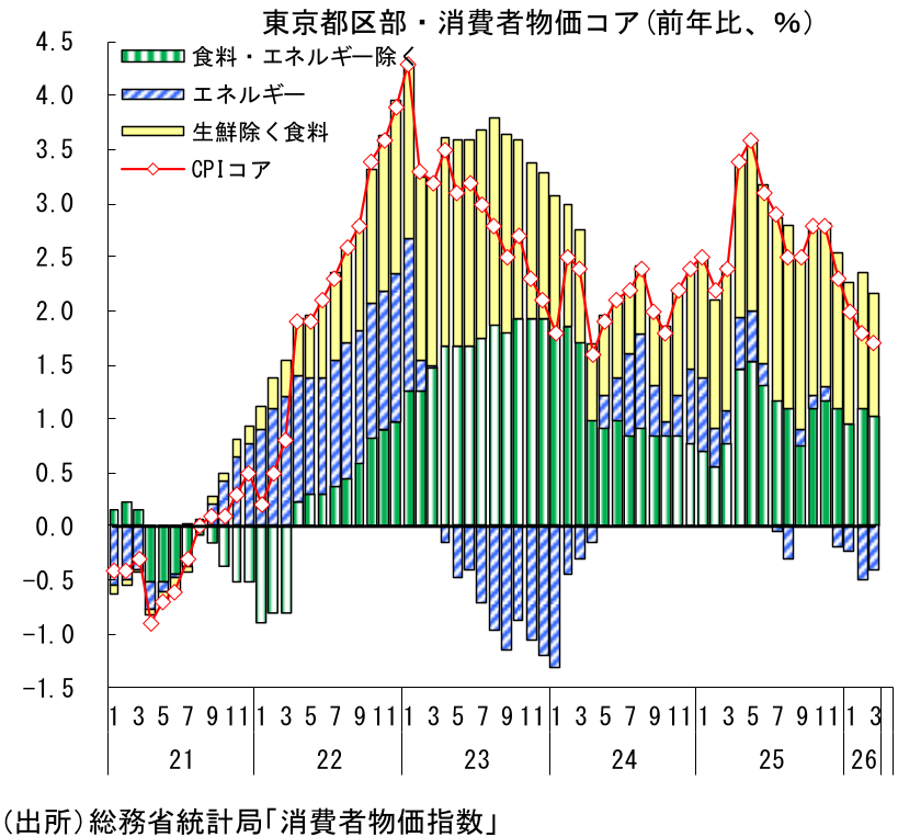 一方、エネルギー以外の価格については不透明感が強い。25年10月の値上げラッシュの後、11月以降は食品値上げに一服感が出ているが、足元の原油価格高騰と円安の進行は今後の値上げの格好の材料となり得る。かつてと異なり企業が値上げをためらわなくなっている現在、円安と資源高を言い訳として、食品以外でも値上げに踏み切る企業が増える可能性があるだろう。前述のとおり、前年の高い伸びの裏が出ることで、先行きの日銀版コアは鈍化しやすい状況にあるが、仮に円安・資源高を理由とした値上げが積極化した場合にはその限りではない。この場合、CPIが4月以降に再び+2%台に戻る展開も十分考えられるだろう。