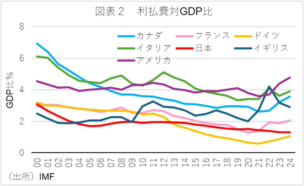 利払い対GDP比:年間の利払い費用をGDPで割った指標(図表2)。