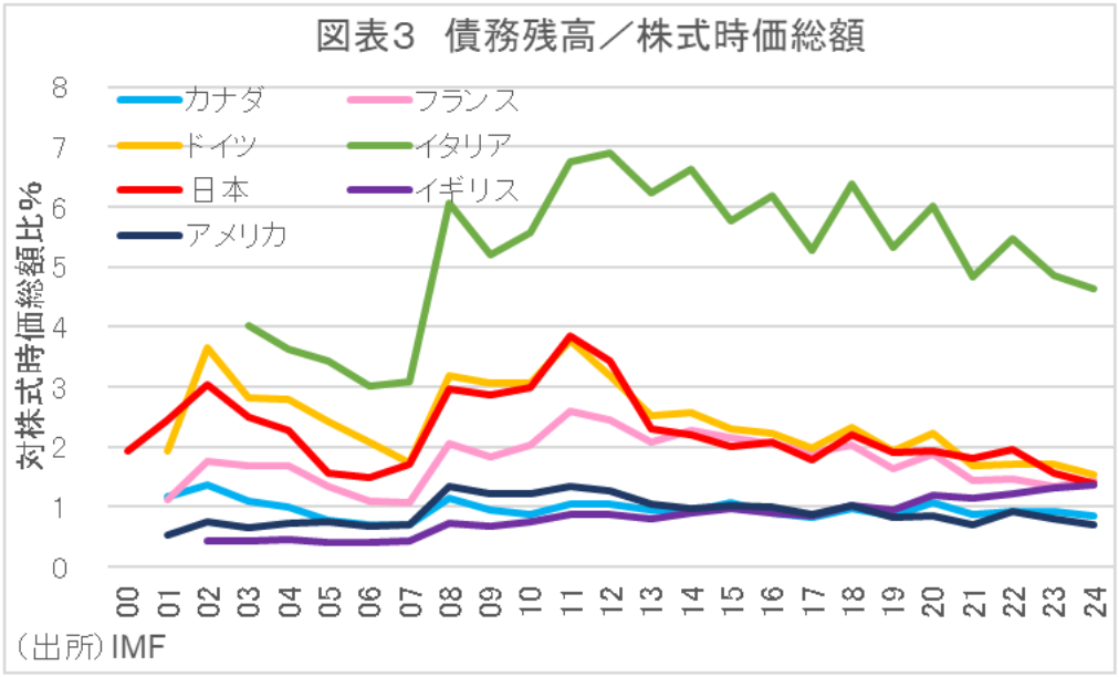 - 債務対株式時価総額比: 債務残高を、国の経済状況を測るための間接的な指標としての株式市場時価総額で割った指標(図表3)。