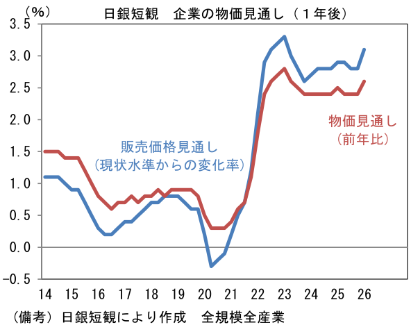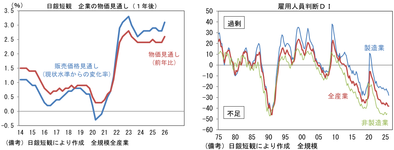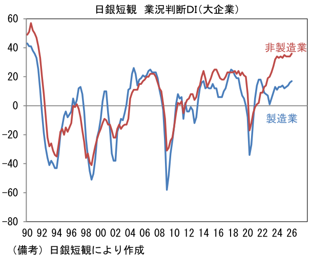 大企業非製造業は+36と前回調査対比横ばいで、1991年以来の高水準を維持した。インバウンド需要に頭打ち感がみられる一方、旺盛なDX関連投資、高止まりする建設需要が背景にあるとみられる。また高市政権に対する期待もあってか消費者心理の好転が観察される下、個人消費が持ち直し傾向にあることも景況感改善に寄与したとみられる。ガソリンの旧暫定税率廃止に加え、お米や生鮮食品の価格が安定したことも追い風になった形だ。先行き判断DIは大企業製造業が+14となり、現況対比3pt低下。大企業非製造業は+29と現況対比7pt低下と慎重な見通しであったが、これはこのところ毎回のように観察される、いわゆる統計のクセであり、必ずしも原油高の影響を懸念して景気の先行きに慎重になっている訳ではないと推察される。