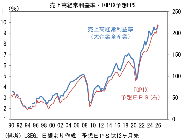 TOPIX構成銘柄と属性の近い大企業全産業の業況判断DIは+27と、前回調査対比2pt上昇。TOPIXの予想EPSと密接に連動する売上高経常利益率の当年度計画は+9.69%と前回調査から上昇。高付加価値化と値上げによって収益力は一段と高まっている。