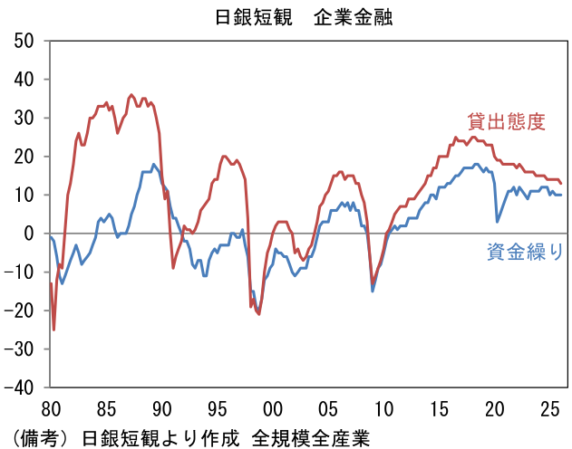 業種別にみると、大企業製造業では自動車(12月調査:+9→3月調査:+13、以下同じ)が改善。2025年9月にトランプ関税が穏健化(27.5%→15%)し、輸出採算が改善するもと、米国向けの輸出が底堅さを維持していることで、業況が上向いたと判断される。その他ではAI関連需要に支えられた電気機械(+21→+22)がプラス幅を拡大。堅調な設備投資計画を背景に、はん用機械(+27→+34)、生産用機械(+16→+26)が高水準から一段と改善したほか、業務用機械(+9→+15)も堅調に推移した。非鉄金属(+13→+23)はAI用途の電線需要が高まったほか、在庫評価益も押し上げに効いたとみられる。食料品(+9→+9)は値上げが奏功してプラス圏を維持した。造船・重機(+35→+35)はさすがに一服感がみられるが、造船、国防、インフラ再構築の重要性が増すなか、DIは異例の高水準にある。他方、化学(+19→+14)は低下した。汎用性の高い品目は中国勢の安値攻勢により国際市況が軟化し収益性が低下したとみられる。鉄鋼(▲15→▲15)も中国勢との競合がきついなか、冴えなかった。