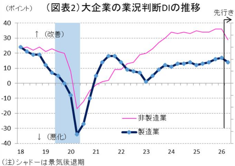 4月1日に発表された短観では、大企業・製造業の業況判断DIが前回比+1ポイントの改善となった(前回16→17、図表1、2)。しかし、先行きの業況については▲3ポイントの悪化を予想している(前回の変化幅は▲1ポイント)。イラン攻撃が2月28日に始まり原油市況が急騰したが、今回調査の集計時点ではその影響が部分的にしか織り込まれていない可能性がある。それでも先行きの不安が▲3ポイントも悪化する予想なのである。
