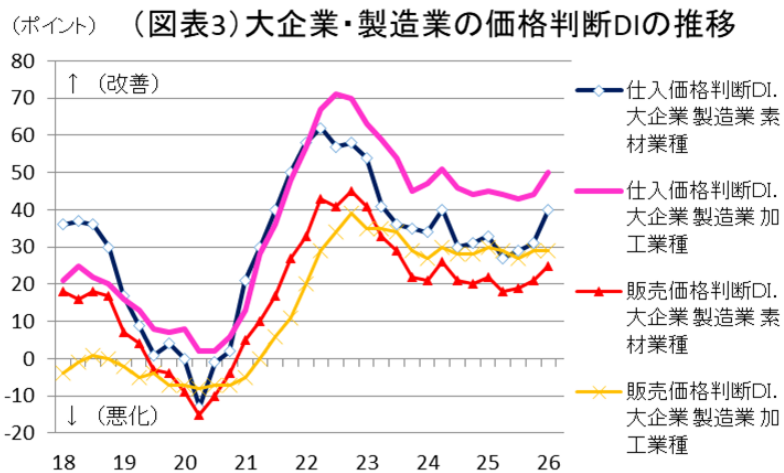 - イラン攻撃の影響は、製造業の仕入価格判断DIを上昇させている。企業の物価見通しにもそうした変化がみられる。