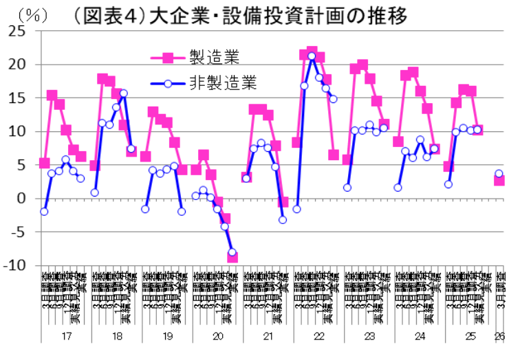 これまでもそうだが、設備投資は強い(図表4、5)。大企業・製造業の2025年度計画は前年比12.3%と二桁の伸びである。今回が初回調査となる2026年度計画では前年比2.7%とさすがに小幅だが、これから上方修正されるだろう。