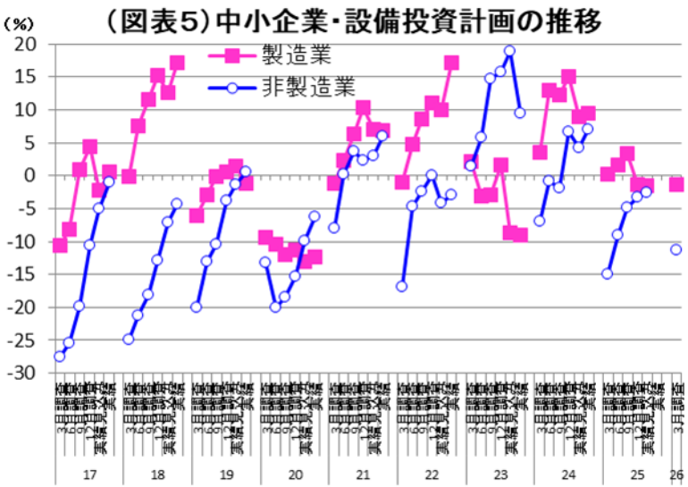 中小企業・製造業の2025年度設備投資計画は、前年比▲1.5%とマイナスであり、大企業とは少し温度差がある。2026年度の初回計画でも、前年比▲1.4%と小幅のマイナスが予想されている。